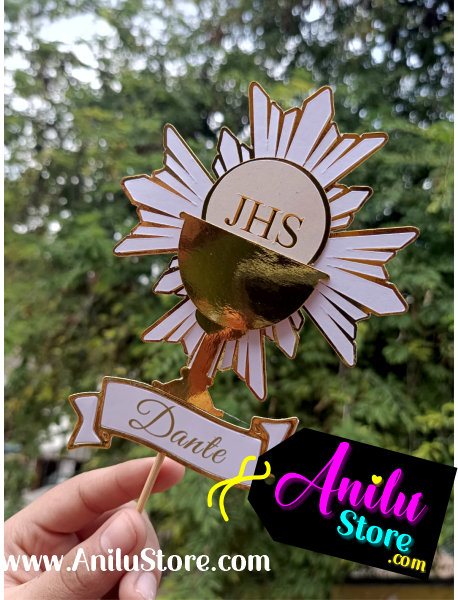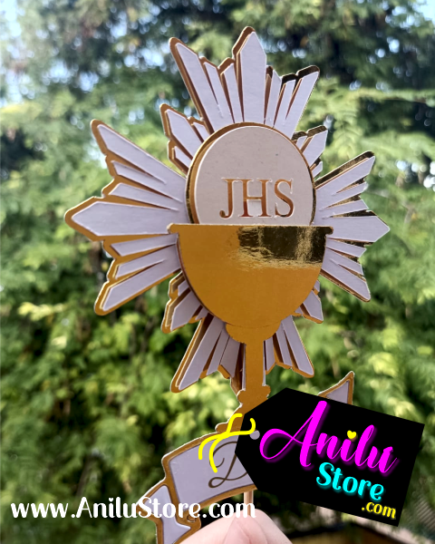 Decore su pastel con este bello topper Cake de Primera Comunión. Cáliz, ostia, destello en capas, figuras en capas.